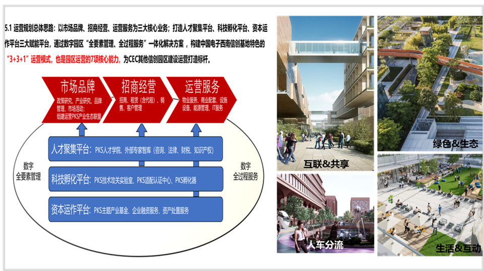 3.打造数字园区、人文园区、生态园区。基于重庆市“两点”、“两高”、“两地”优势,打造高品质工作环境、人才政策、休闲设施、配套服务,成为对全球顶尖人才具有强大吸引力的魅力之园。