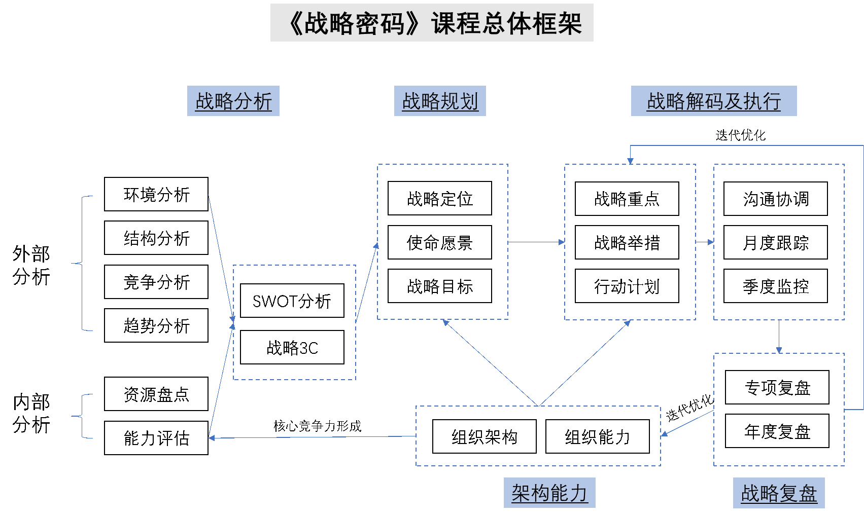 从组织架构和企业文化两个对战略最重要的支撑因素进行设计,架构与战略密不可分,战略决定架构,架构支撑战略;组织能力是由制度、流程、技能、领导力、文化等要素构成的,能力支撑目标达成,企业如何对自身能力进行诊断,并持续加强能力建设,最终形成企业独特的、具有竞争优势的核心能力。