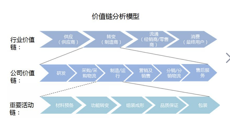 价值链分析一方面是企业内部的价值链分析,主要是对企业自身各环节的梳理诊断;另一方面是纵向价值链分析,主要是为了进一步增强企业对外的竞争力。纵向价值链分析则主要反映企业于供应商、销售商之间的相互依存关系。通过对企业上下游企业及产品与本企业价值链的紧密链接,往往可以十分显著的在生产成本上得到体现,甚至可以影响相关上下游企业的成本。