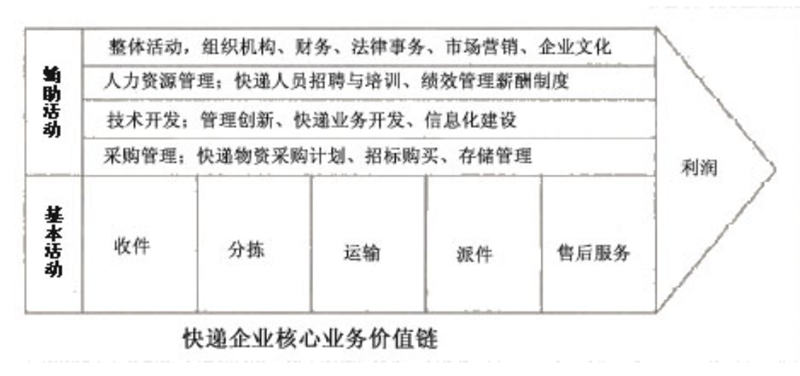 一般来说,快递企业核心业务的服务流程主要包括收件、分拣(包括分发处理和接收处理)、运输、派件等四大环节,它们构成了快递企业价值链的主要活动,为快递企业创造价值。根据通用企业价值链模型,构建了快递企业核心业务的基本价值链: