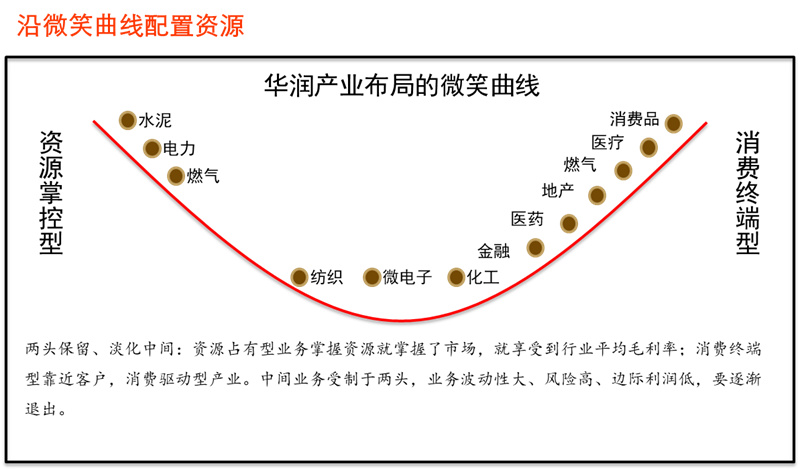 经过系列研讨,确定了华润独特的多元化发展模式:主营业务逐步向资源掌控型和消费终端型产业靠拢,形成“微笑曲线”的行业布局。