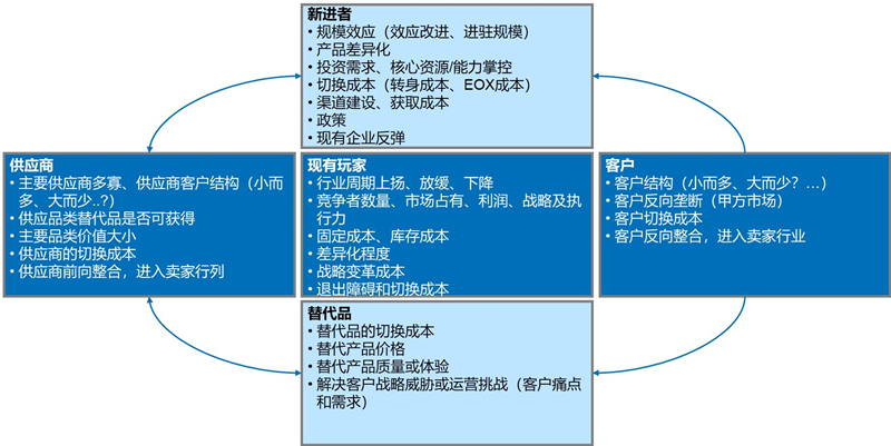 值得注意的是,波特五力具备动态特性,需要结合宏观环境和五力之间的影响进行推演和研判。首先,外部宏观环境趋势会带来波特五力的变化,如:生态、政治因素对供应的影响、经济发展对消费能力的影响等。其次,五力之间也存在相互影响,如:企业倒逼上游供应商降本提质,上游供应商获得低成本、高质量量产能力后,加剧行业新进者的进入(手机终端);竞争变得激烈后,上游供应商会获得更大议价能力(新能源汽车电池)……
