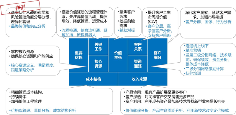 商业模式展示了企业创造收入的逻辑,涉及9个模块,包括客户细分、价值主张、渠道通路、客户关系、收入来源、核心资源、关键业务、重要伙伴、成本结构。企业可重新检视这些要素,识别商业模式升级的可能空间。