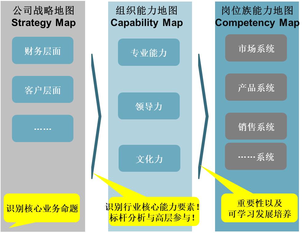 就像现在非常流程的公式:组织成功=组织战略*组织能力 所表述的,组织能力是需要与战略匹配一致的,我们以往那种基于价值链、基于岗位序列的建模方式太间接了,为什么不直接将战略地图分解为组织能力地图,再将组织能力地图分解为岗位能力地图?可能以前总担心对战略的理解不到位,这种对应难度很大,现在HR对战略已经很了解了,做这种分解就会很有信心,能够抓住战略的要点。基于这个组织能力地图和岗位能力地图,再进行后备人才的筛选和培养,其对战略的支撑性会更直接、效果也会更显现。
