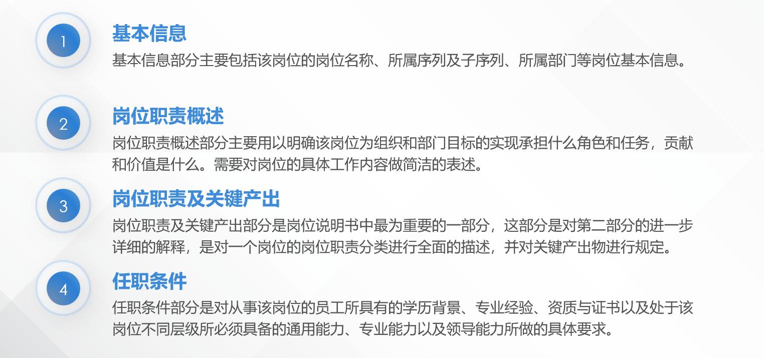 岗位说明书一共分为基本信息、岗位职责概述、岗位职责及关键产出以及任职条件四个部分: