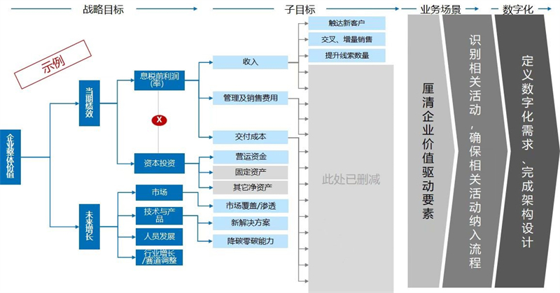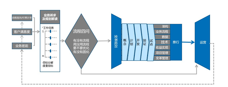 承接企业的战略目标,将战略目标层层拆解成子目标,针对子目标识别企业价值驱动要素,即干哪些事情可以支持子目标达成,识别与这些事情相关的业务活动,确保这些业务活动被纳入相关流程,以便支持未来的高质量业务复制。这些落实在具体业务环节中的活动,也被称为场景。根据流程定义数字化需求,完成架构设计,使得数字平台可以无缝支持和驱动业务。企业通过业务流程管理(BPM)来创建、设计和分析构成其业务核心的流程。通过回溯整体流程或分门别类审查业务流程,分析业务流程的当前状态,可确定改进领域,依据问题根本原因进行优化。通过数字化手段,可进一步提升流程效率和效果,提高运营质量并减少资源浪费。BPM是一套闭环的、支持持续改进的框架,是企业变革管理的关键抓手。