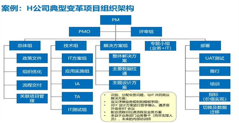 其中包含变革负责人PM也就是项目经理对变革项目负责,领导着PMO项目管理小组及评审组负责项目的监督,确保交付质量。下设五个小组分别是总体组、技术组、解决方案组、专题小组及部署。