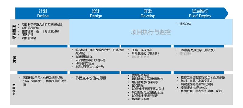 “三横四纵”管理体系是“七横八纵”管理体系的简化,变革管理可以简化为三个层面包含项目管理、方案及变革管理。变革项目按照结构化流程开展,可以简化为计划、设计、开发、试点,四个层面。