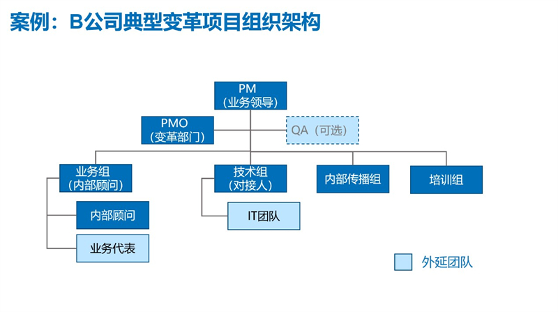 在大范围数字化转型项目下,设计流程范围较广。方案较为复杂,变革周期长(1年以上,多项目阶段),通常有咨询公司介入。此时,数字化转型的组织结构也相对复杂。我们以某公司转型项目组为例:
