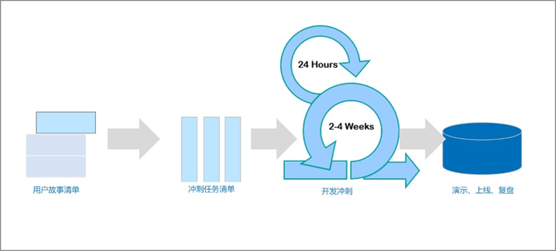 在敏捷开发过程中首先要明白客户需求,并且对需求进行总结分出优先级,也就是下图中用户故事清单;其次明确冲刺任务清单,并由每个任务负责人进行展示;接下来就是开发冲刺,这里用冲刺这个词也表明了开发速度要快,并且记录当前周期的完成情况;最后开发完成进行演示、上线发布及复盘。