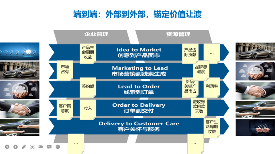 在一个企业里面,通常我们会关注收入、利润、客户满意、市场占有率等经营目标。这些目标的达成程度体现了企业与市场发生有效价值交换的能力。从我们识别市场的需求,到产品卖出去,把钱收回来,再到维持交换关系,我们需要厘清“价值”通过哪些关键过程得以实现。如果我们把市场作为起点和终点,可以识别从外部到外部,端到端的活动,通常,我们把这些活动归纳为5个一级核心流程。