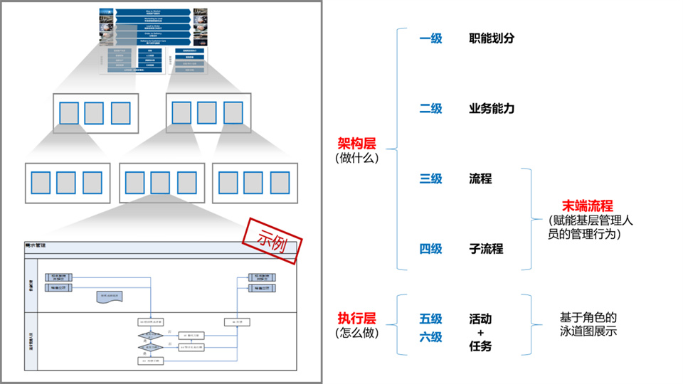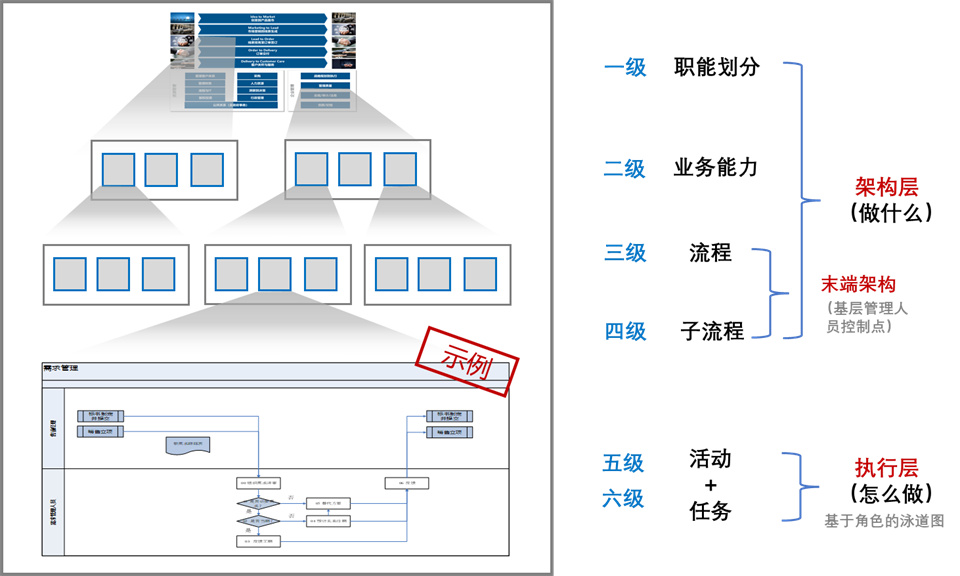 通常流程被分为6级来管理。一到4级指的架构层,管理做什么,5级、6级流程在执行层进行描述,管理怎么做。