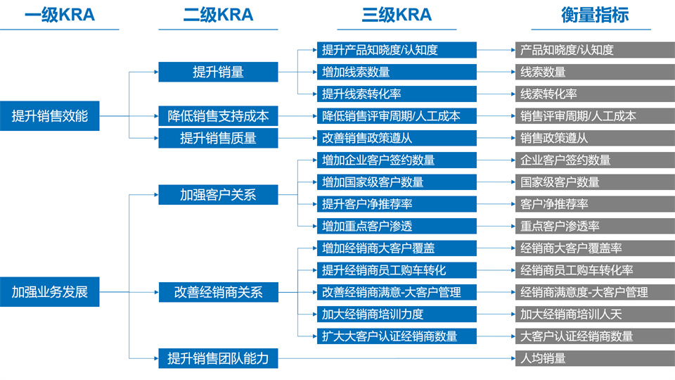 价值树和问题树分析,对于企业级流程级部门级都可以适用,通常公司级价值树拆解到与部门活动相关的因子,比如销量、销售额;而流程级价值树,拆解到基层管理人员可控的层级,比如进店数量;部门级价值树拆解到按角色可以响应的执行层级,比如进店等待时长。价值树拆解的时候,定性或者定量都可以。衡量指标最好定量,有时候不是所所有的定性结果都可以衡量,因此不是所有的KRA都会有对应的衡量指标。