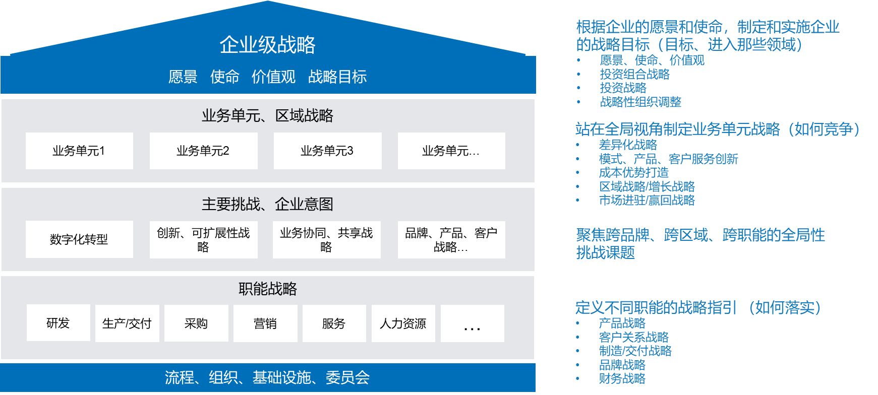 企业的战略是一个多层次体系,从集团(公司)战略、业务战略到职能战略,每个层次的战略回答的是不同层次的关键问题,以下战略图表明了战略的层次以及各自回答的关键问题:
