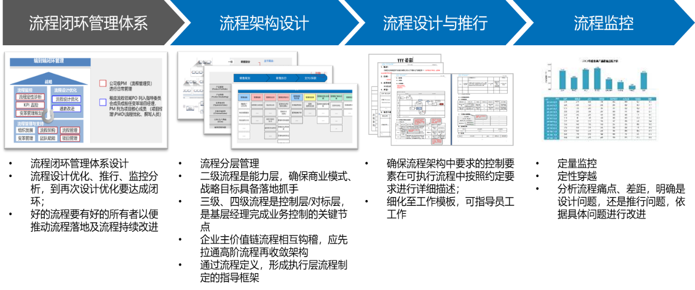 1. 助力企业整体构建流程管理,包括梳理流程闭环管理体系(管理流程的流程),流程架构的设计、执行层流程设计与推行,设计流程衡量指标体系,助力企业持续改进: